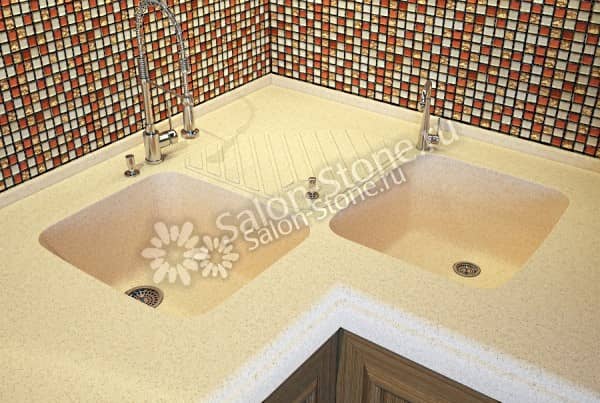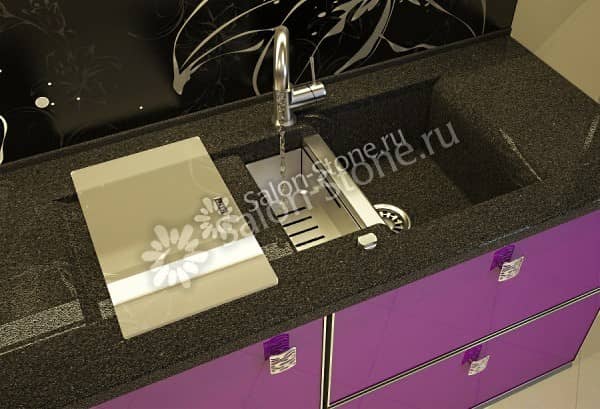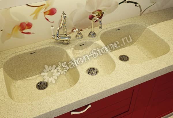 Готовое изделие либо вклеивают снизу столешницы, либо вровень с ней, что способствует образованию целостной и единой ровной поверхности. Очень часто столешницу интегрируют с мойками из других материалов.